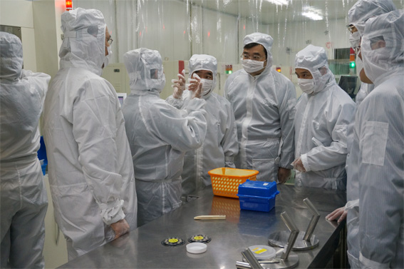 此次調(diào)研,我們陪同市委組織部的領(lǐng)導(dǎo)們參觀了芯片車間的工藝流程,并做了簡(jiǎn)單的工藝介紹。為了能夠近距離的了解到我們的產(chǎn)品,在開發(fā)區(qū)管委會(huì)主任季允豐的陪下,同市委組織部部長(zhǎng)張愛軍等一行6人便穿著無(wú)塵服前去外研車間近距離的觀察、了解我們的產(chǎn)品及性能介紹,并對(duì)我揚(yáng)州乾照光電有限公司引進(jìn)的高層次人才給予了高度的認(rèn)可。