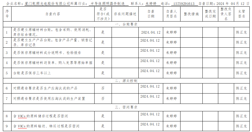 廈門市揮發(fā)性有機物污染防治企業(yè)自查表(本企業(yè)對表格數(shù)據(jù)內(nèi)容負(fù)責(zé)) 企業(yè)名稱:廈門乾照光電股份有限公司所屬行業(yè):半導(dǎo)體照明器件制造 聯(lián)系人:朱婷婷 電話:15759291613自查日期:2024年04月12日 ...