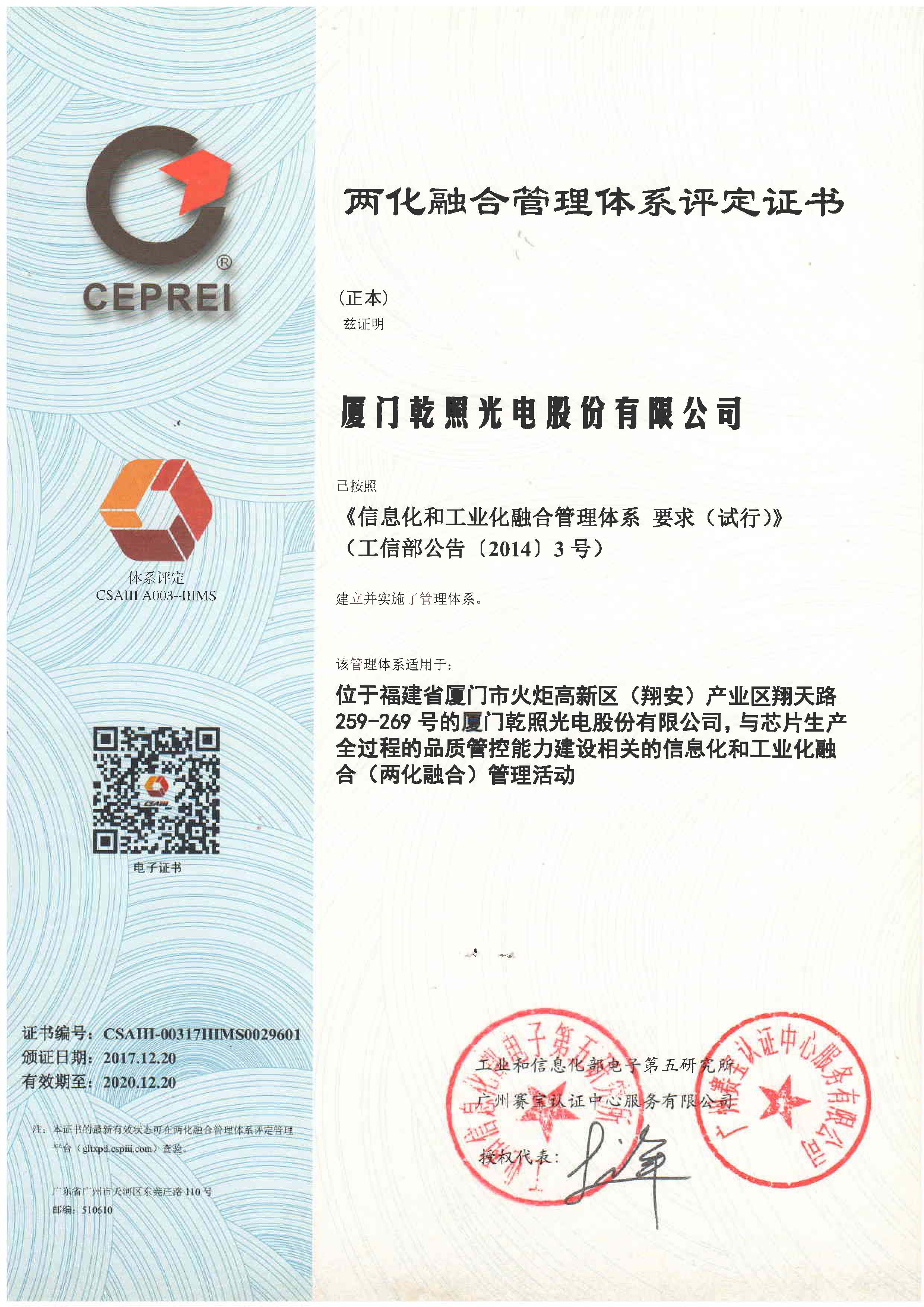 2017年12月20日,廈門乾照光電股份有限公司獲得兩化融合管理體系評定證書。這標(biāo)志著乾照光電已建立起兩化融合管理體系,并在推進(jìn)信息化和工業(yè)化深度融合方面取得顯著成效,在公司戰(zhàn)略轉(zhuǎn)型、組織變革、管理創(chuàng)新、技術(shù)融合和...