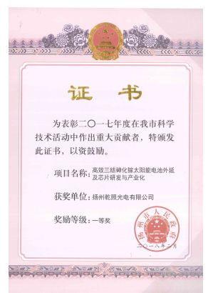 日前,揚(yáng)州市政府公布了2017年度科學(xué)技術(shù)獎(jiǎng)獲獎(jiǎng)情況。揚(yáng)州乾照光電有限公司申報(bào)的“高效三結(jié)砷化鎵太陽電池外延及芯片研發(fā)與產(chǎn)業(yè)化”項(xiàng)目,在眾多優(yōu)秀成果中脫穎而出,榮獲揚(yáng)州市科技進(jìn)步獎(jiǎng)一等獎(jiǎng)。 該項(xiàng)目采用頂電...